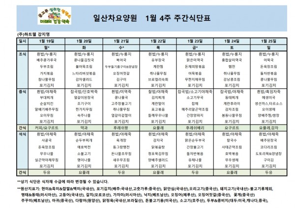 일산차요양원 26년 1월4주 식단표 페이지 정보 작성자 최고관리자 댓글 댓글 0건 조회Hit 24회 작성일Date 26-02-20 14:50 본문 일산차요양원 26년 1월4주 식단표 목록 이전글일산차요양원 26년 1월5주 식단표 26.02.20 다음글일산차요양원 26년 1월3주 식단표 26.02.20 댓글 0 댓글목록 등록된 댓글이 없습니다.