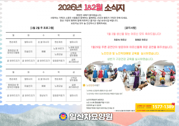 2026년도 1월 2월 소식지 페이지 정보 작성자 최고관리자 댓글 댓글 0건 조회Hit 11회 작성일Date 26-03-25 15:26 본문 2026년도 1월 2월 소식지 목록 이전글3월 생신잔치 초대장 26.03.25 다음글2월 생신잔치 초대장 26.01.26 댓글 0 댓글목록 등록된 댓글이 없습니다.