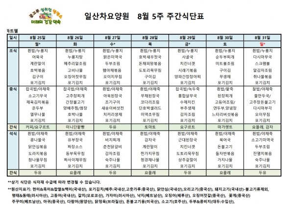 일산차요양원 25년8월5주 식단표 페이지 정보 작성자 최고관리자 댓글 댓글 0건 조회Hit 168회 작성일Date 25-10-02 14:24 본문 일산차요양원 25년8월5주 식단표 목록 이전글일산차요양원 25년9월1주 식단표 25.10.02 다음글일산차요양원 25년8월4주 식단표 25.10.02 댓글 0 댓글목록 등록된 댓글이 없습니다.