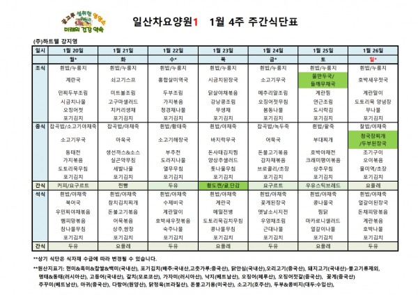일산차요양원 25년 1월 4주 식단표 페이지 정보 작성자 최고관리자 댓글 댓글 0건 조회Hit 280회 작성일Date 25-03-18 11:05 본문 일산차요양원 25년 1월 4주 식단표 목록 이전글일산차요양원 25년 1월 5주 식단표 25.03.18 다음글일산차요양원 25년 1월 3주 식단표 25.03.18 댓글 0 댓글목록 등록된 댓글이 없습니다.
