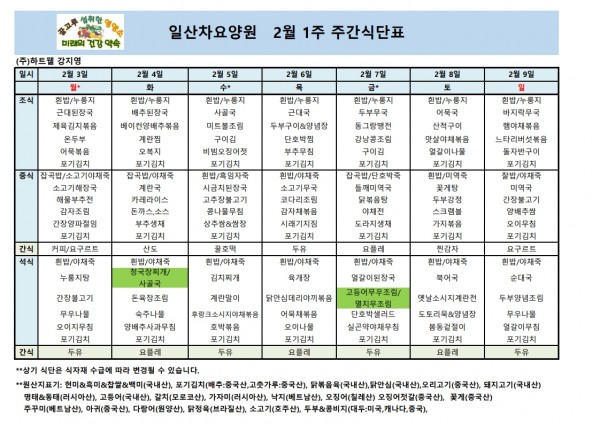일산차요양원 25년 2월 1주 식단표 페이지 정보 작성자 최고관리자 댓글 댓글 0건 조회Hit 229회 작성일Date 25-03-18 11:08 본문 일산차요양원 25년 2월 1주 식단표 목록 이전글일산차요양원 25년 2월 2주 식단표 25.03.18 다음글일산차요양원 25년 1월 5주 식단표 25.03.18 댓글 0 댓글목록 등록된 댓글이 없습니다.