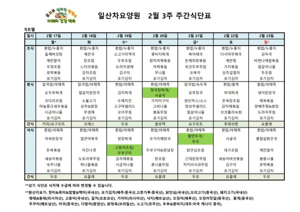 일산차요양원 25년 2월 3주 식단표 페이지 정보 작성자 최고관리자 댓글 댓글 0건 조회Hit 250회 작성일Date 25-03-18 11:09 본문 일산차요양원 25년 2월 3주 식단표 목록 이전글일산차요양원 25년 2월 4주 식단표 25.03.18 다음글일산차요양원 25년 2월 2주 식단표 25.03.18 댓글 0 댓글목록 등록된 댓글이 없습니다.