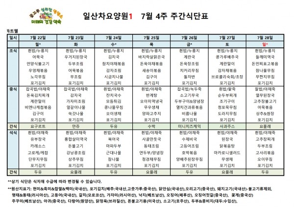 일산차요양원 24년 7월 4주 식단표 페이지 정보 작성자 최고관리자 댓글 댓글 0건 조회Hit 280회 작성일Date 24-12-16 18:05 본문 일산차요양원 24년 7월 4주 식단표 목록 이전글일산차요양원 24년 7월 5주 식단표 24.12.16 다음글일산차요양원 24년 7월 3주 식단표 24.12.16 댓글 0 댓글목록 등록된 댓글이 없습니다.