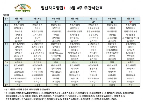 일산차요양원 24년 8월 4주 식단표 페이지 정보 작성자 최고관리자 댓글 댓글 0건 조회Hit 249회 작성일Date 24-12-16 18:15 본문 일산차요양원 24년 8월 4주 식단표 목록 이전글일산차요양원 24년 8월 5주 식단표 24.12.16 다음글일산차요양원 24년 8월 3주 식단표 24.12.16 댓글 0 댓글목록 등록된 댓글이 없습니다.