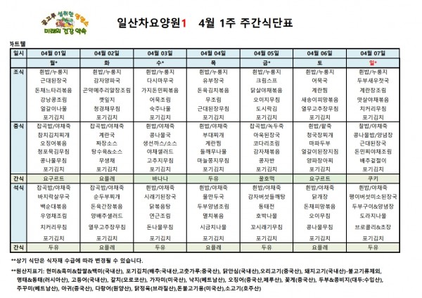 일산차요양원 24년 4월 1주 식단표 페이지 정보 작성자 최고관리자 댓글 댓글 0건 조회Hit 226회 작성일Date 24-12-16 17:38 본문 일산차요양원 24년 4월 1주 식단표 목록 이전글일산차요양원 24년 4월 2주 식단표 24.12.16 다음글일산차요양원 24년 3월 5주 식단표 24.12.16 댓글 0 댓글목록 등록된 댓글이 없습니다.