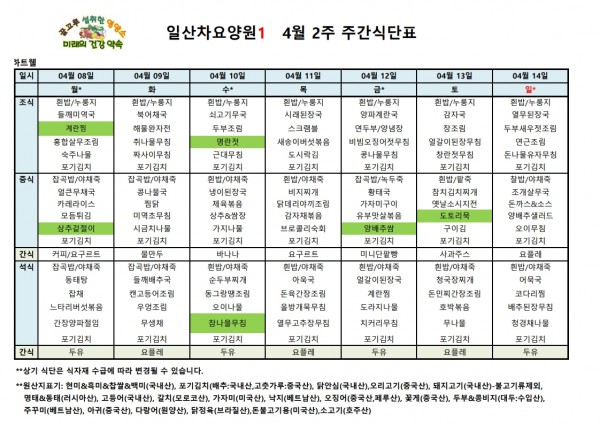 일산차요양원 24년 4월 2주 식단표 페이지 정보 작성자 최고관리자 댓글 댓글 0건 조회Hit 254회 작성일Date 24-12-16 17:39 본문 일산차요양원 24년 4월 2주 식단표 목록 이전글일산차요양원 24년 4월 3주 식단표 24.12.16 다음글일산차요양원 24년 4월 1주 식단표 24.12.16 댓글 0 댓글목록 등록된 댓글이 없습니다.