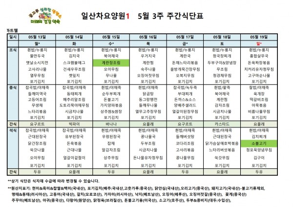 일산차요양원 24년 5월 3주 식단표 페이지 정보 작성자 최고관리자 댓글 댓글 0건 조회Hit 238회 작성일Date 24-12-16 17:43 본문 일산차요양원 24년 5월 3주 식단표 목록 이전글일산차요양원 24년 5월 4주 식단표 24.12.16 다음글일산차요양원 24년 5월 2주 식단표 24.12.16 댓글 0 댓글목록 등록된 댓글이 없습니다.