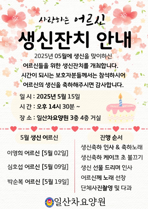 5월 생신잔치 초대장 페이지 정보 작성자 최고관리자 댓글 댓글 0건 조회Hit 304회 작성일Date 25-05-30 17:53 본문 5월달에 생신을 맞이하신 어르신께 진심으로 생신을 축하드립니다. 목록 이전글6월 생신잔치 초대장 25.05.30 다음글2024년도 3월 4월 소식지 25.04.29 댓글 0 댓글목록 등록된 댓글이 없습니다.