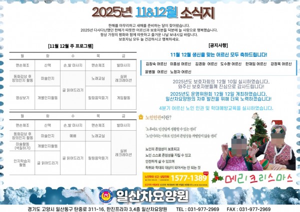2025년도 11월 12월 소식지 페이지 정보 작성자 최고관리자 댓글 댓글 0건 조회Hit 243회 작성일Date 25-12-19 15:26 본문 2025년도 11월 12월 소식지 목록 이전글2026년도 1월 생신잔치 초대장 25.12.19 다음글11월 생신잔치 초대장 25.11.03 댓글 0 댓글목록 등록된 댓글이 없습니다.