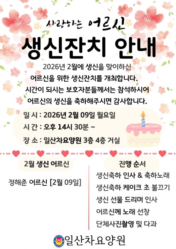 2월 생신잔치 초대장 페이지 정보 작성자 최고관리자 댓글 댓글 0건 조회Hit 175회 작성일Date 26-01-26 11:34 본문 2월 생신잔치 초대장 목록 이전글2026년도 1월 2월 소식지 26.03.25 다음글2026년도 1월 생신잔치 초대장 25.12.19 댓글 0 댓글목록 등록된 댓글이 없습니다.