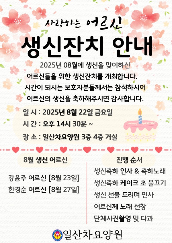 8월 생신잔치 초대장 페이지 정보 작성자 최고관리자 댓글 댓글 0건 조회Hit 494회 작성일Date 25-07-28 17:49 본문 8월 생신잔치 초대장 목록 이전글9월 생신잔치 초대장 25.08.27 다음글2025년도 5월 6월 소식지 25.06.30 댓글 0 댓글목록 등록된 댓글이 없습니다.