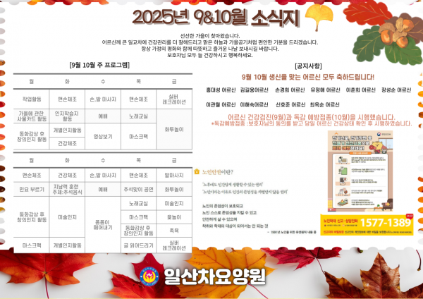 2025년도 9월 10월 소식지 페이지 정보 작성자 최고관리자 댓글 댓글 0건 조회Hit 420회 작성일Date 25-11-03 10:23 본문 2025년도 9월 10월 소식지 목록 이전글11월 생신잔치 초대장 25.11.03 다음글10월 생신잔치 초대장 25.09.23 댓글 0 댓글목록 등록된 댓글이 없습니다.