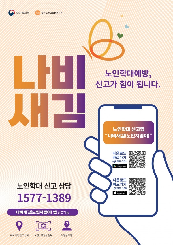 [노인인권보호 공지사항] 노인 학대 신고 상담 번호 1577-1389, 노인학대 신고어플 '나비새김(노인지킴이)"